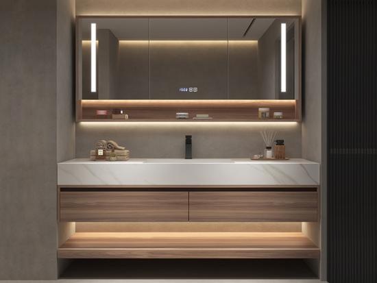 Questo è un mobiletto moderno per il bagno Realizzato in legno impiallacciato con uno specchio intelligente. Dotato di divisori e cassetti, offre un ampio spazio di archiviazione. È dotato di strisce luminose a LED, belle e pratiche.
